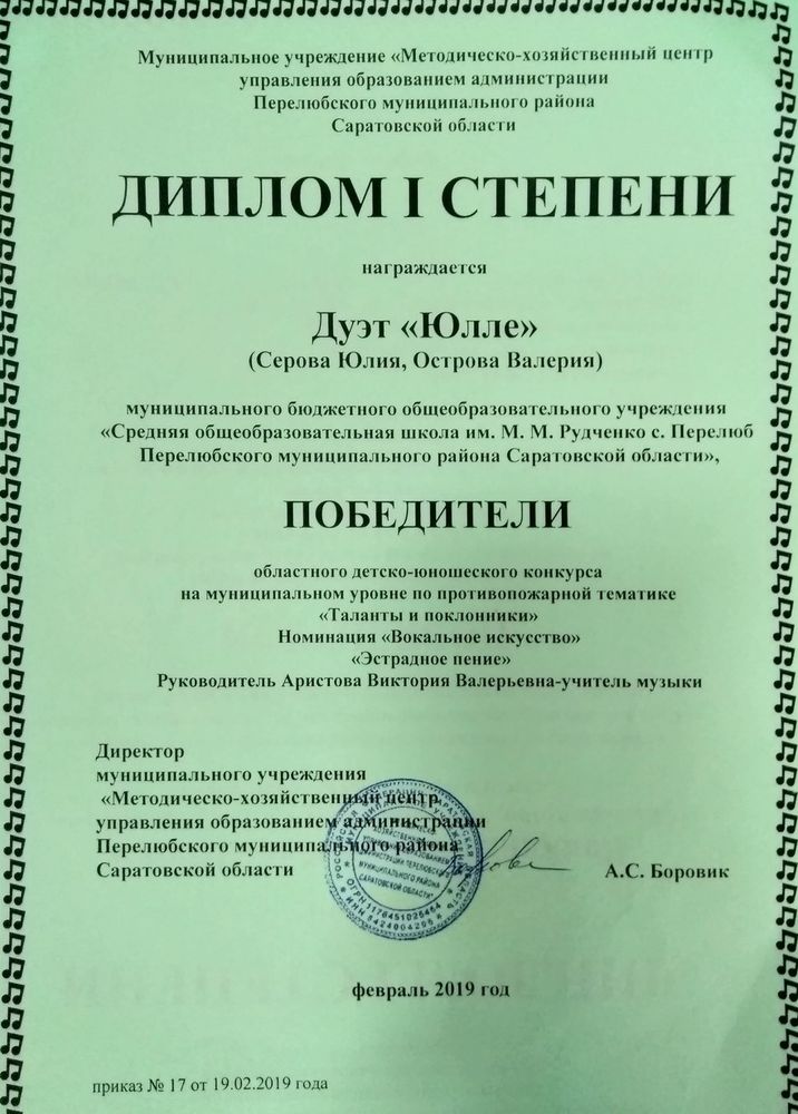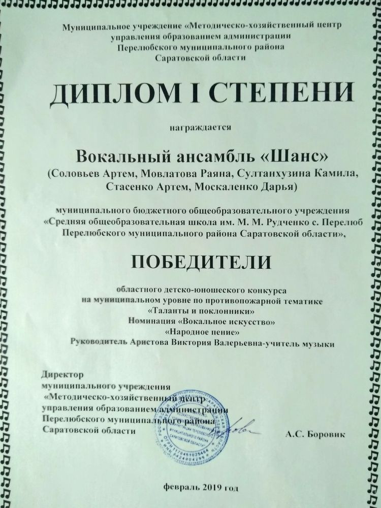 Диплом I степени вокального ансамбля "Шанс" областного детско -юношеского конкурса на муниципальном уровне по противопожарной тематике " Таланты и поклонники" ( руководитель Аристова В.В.)