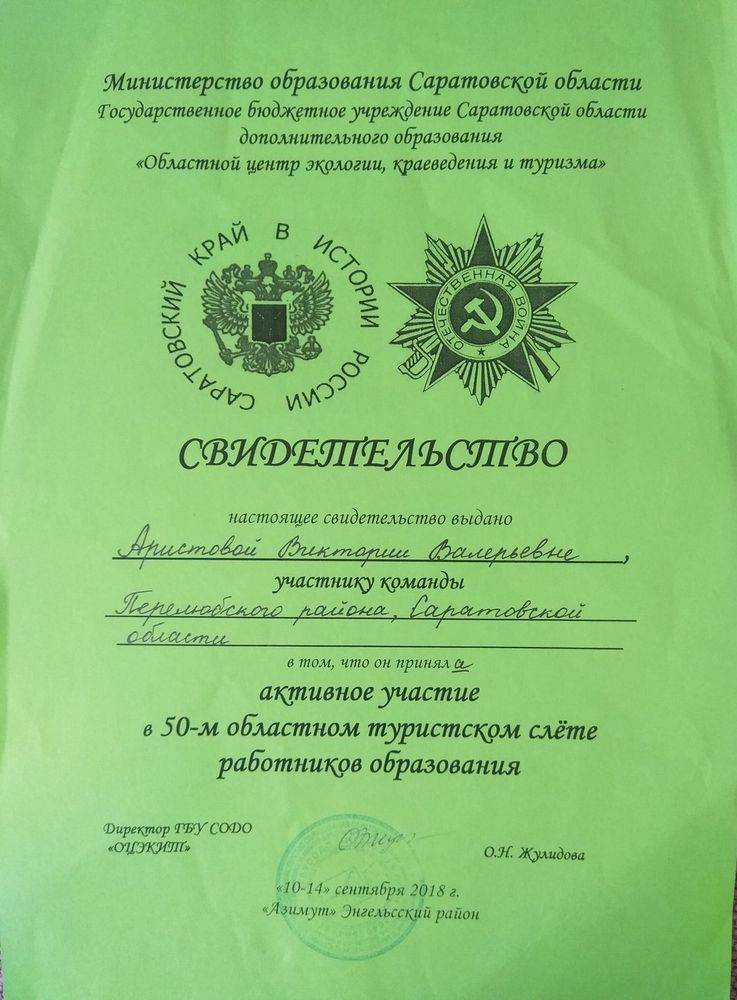 Свидетельство участника за активное участие в 50- м областном туристском слете работников образования ( 2018 год)