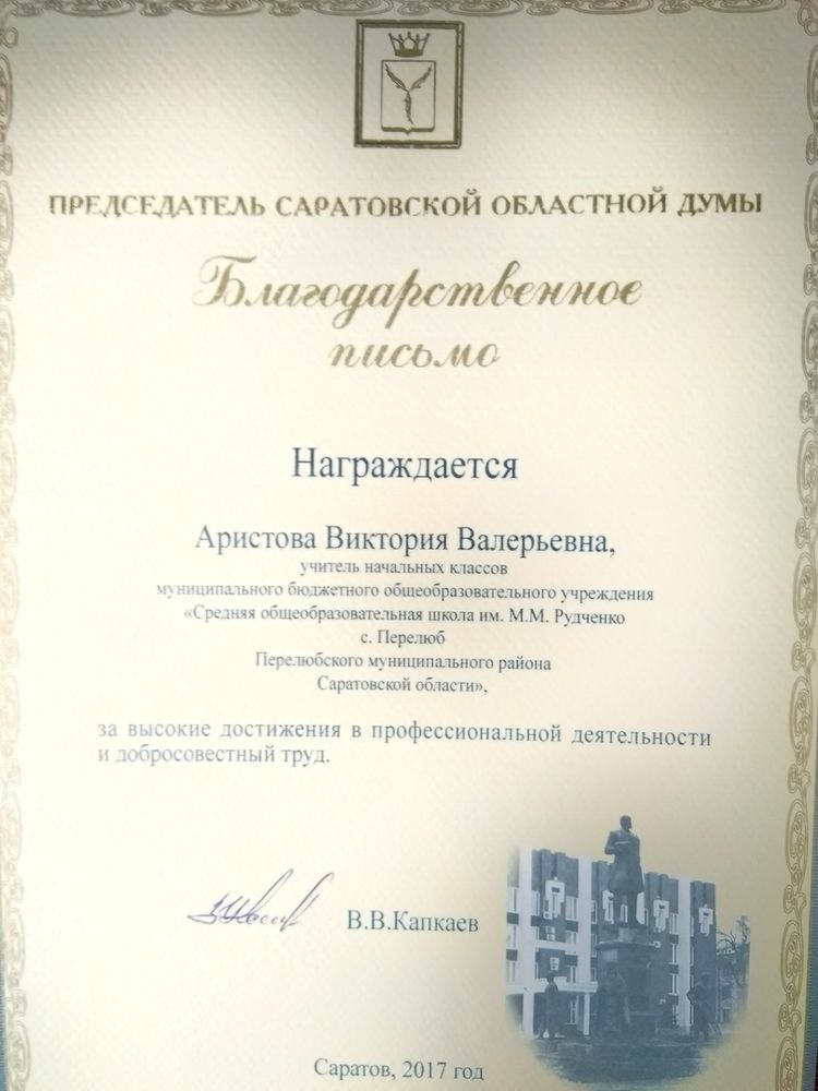 Благодарственное письмо председателя Саратовской областной думы за высокие достижения в профессиональной деятельности и добросовестный труд