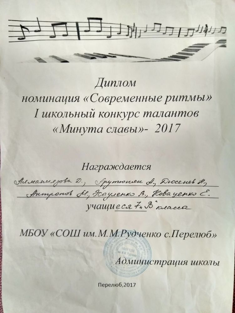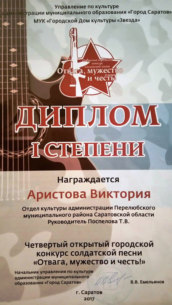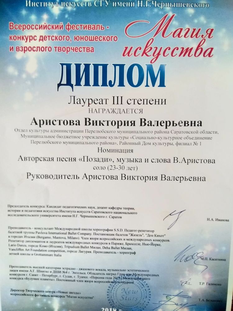 Диплом лауреата III степени во Всероссийском фестивале -конкурсе десткого, юношеского и взрослого творчества ( 2018 год)