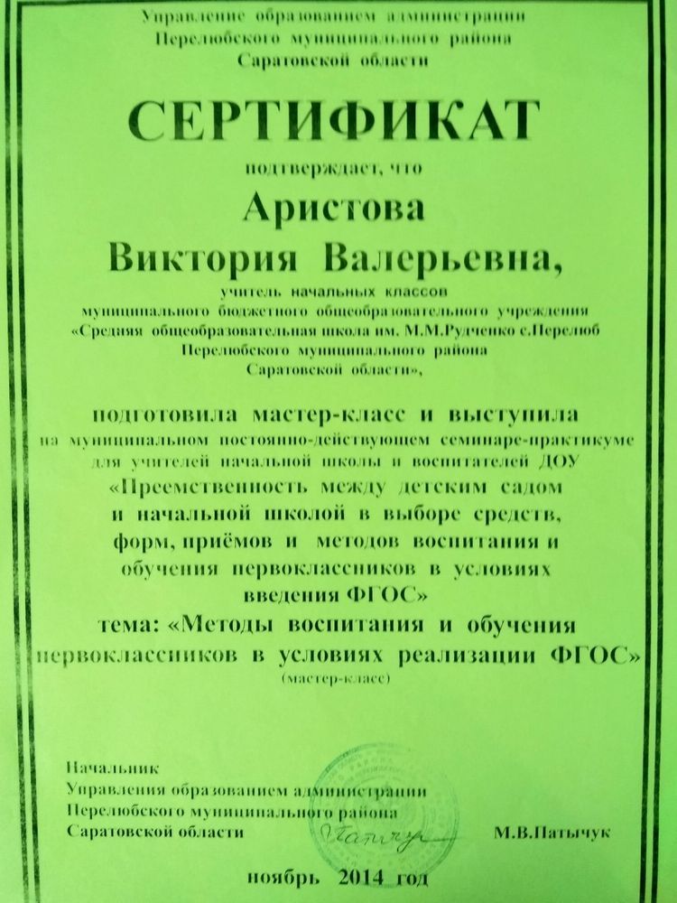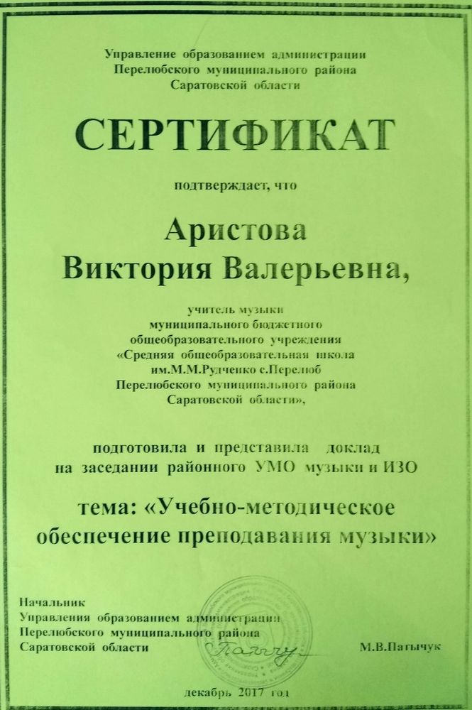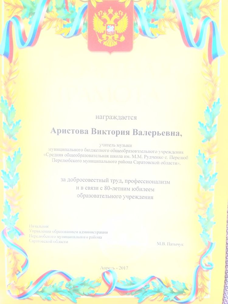 Грамота начальника управления образованием Перелюбского муниципального района ( 2017 год)