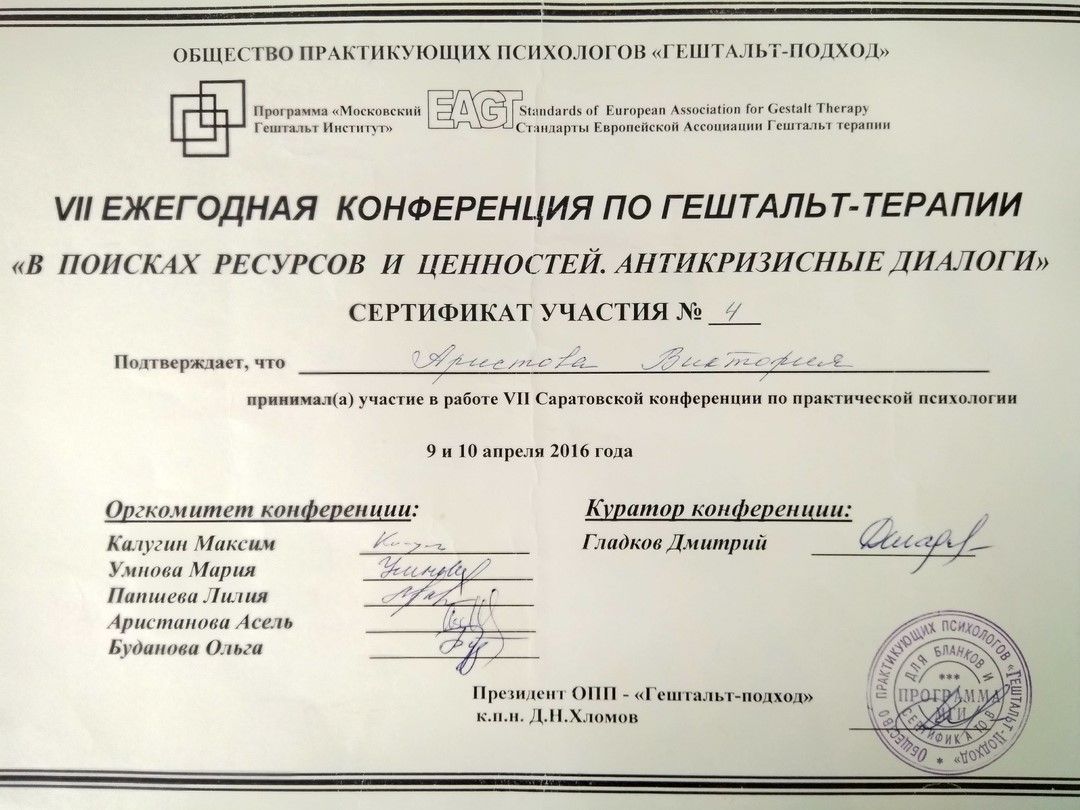 Сертификат участия VII ежегодной конференции по гештальт -терапии