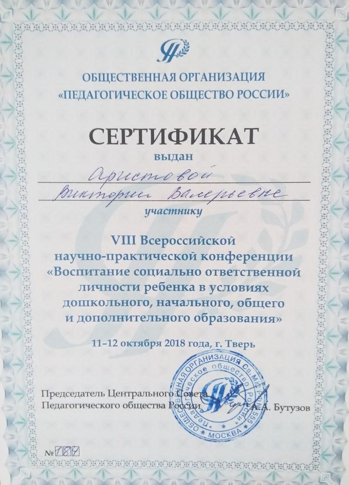 Сертификат VIII Всероссийской научно - практической конференции "Воспитание социально ответственной личности ребенка в условиях дошкольного, начального, общего и дополнительного образования"