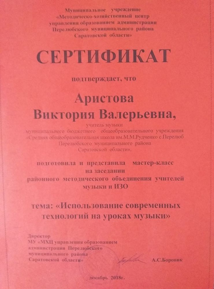 Сертификат участия в районном методическом объединнеии учителей музыки и ИЗО ( 2018 год)