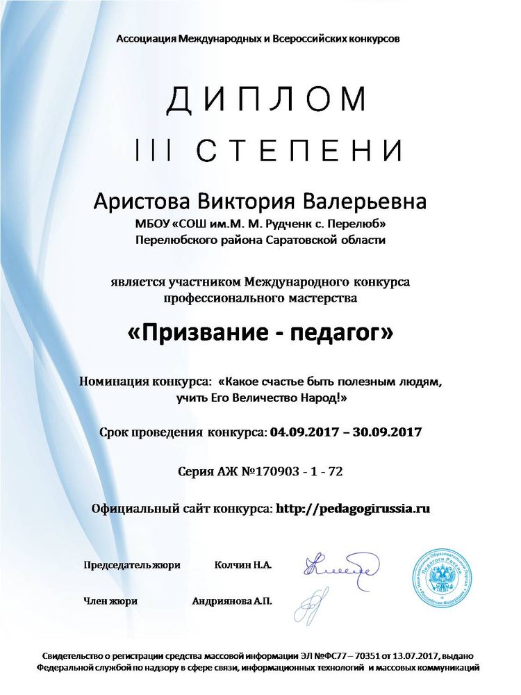 Диплом III степени в Международном конкурсе профессионального мастерства " Призвание- педагог"