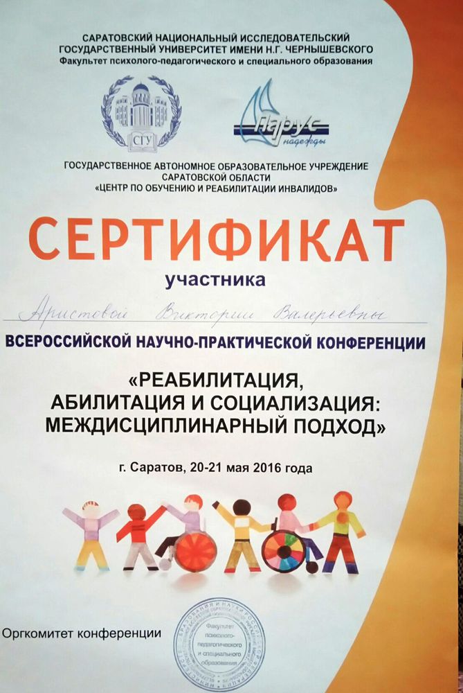 Сертификат участника Всероссийской научно-практической конференции "РЕАБИЛИТАЦИЯ, АБИЛИТАЦИЯ И СОЦИАЛИЗАЦИЯ : МЕЖДИСЦИПЛИНАРНЫЙ ПОДХОД" ( 2016 год)