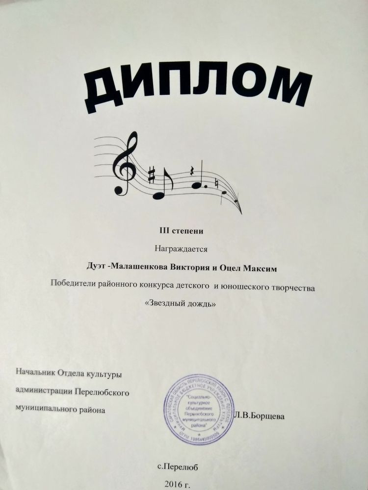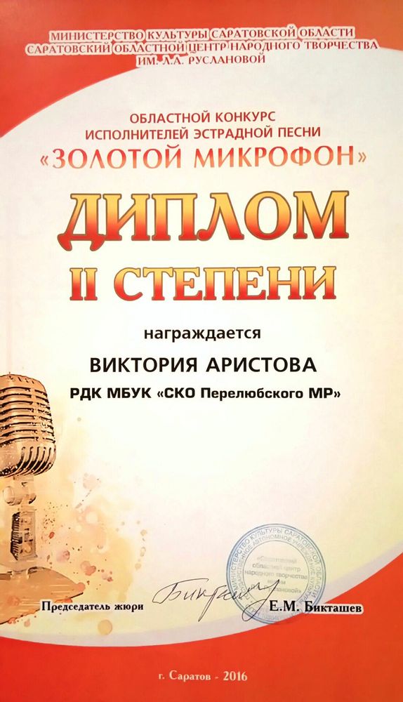 Диплом II степени в областном конкурсе исполнителей эстрадной песни "Золотой микрофон" ( 2016 год)