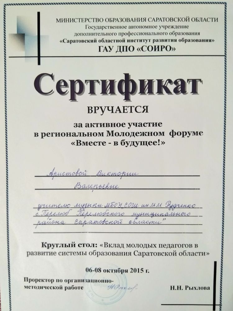 Сертификат за активное участие в региональном Молодежном форуме "Вместе - в будущее!" ( 2015 год)