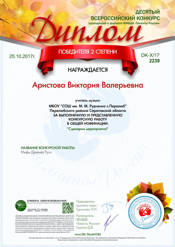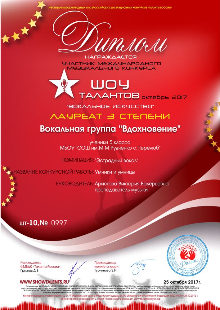 Диплом II степени в десятом Всероссийском конкурсе проходящем в формате ФМВДК "Таланты России"