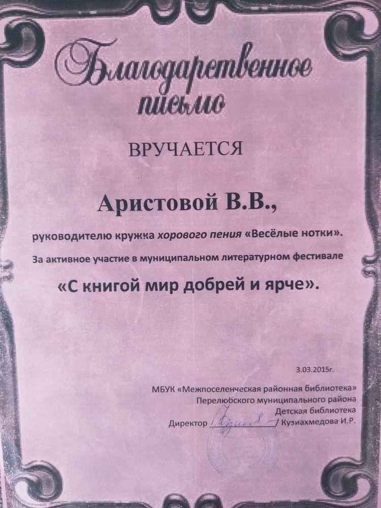 Благодарственное письмо за активное участие в муниципальном литературном фестивале " С книгой мир доброей и ярче" ( 2015 год)