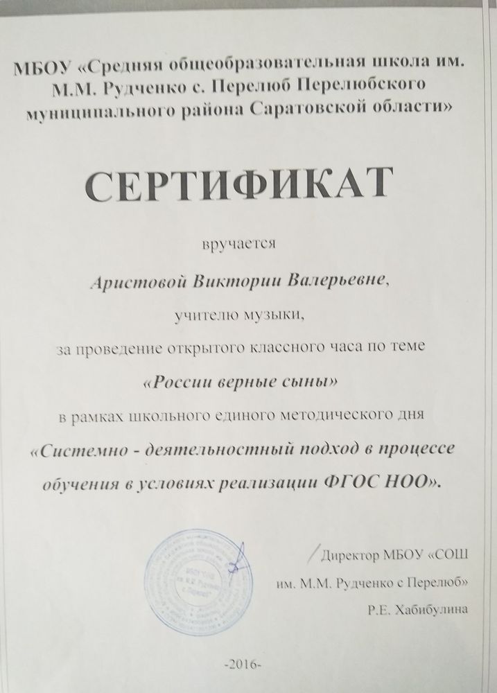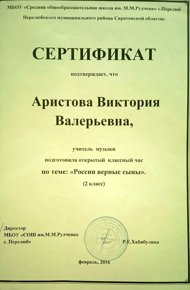 Сертификат за проведение открытого классного часа по теме "России верные сыны" ( 2016 год)