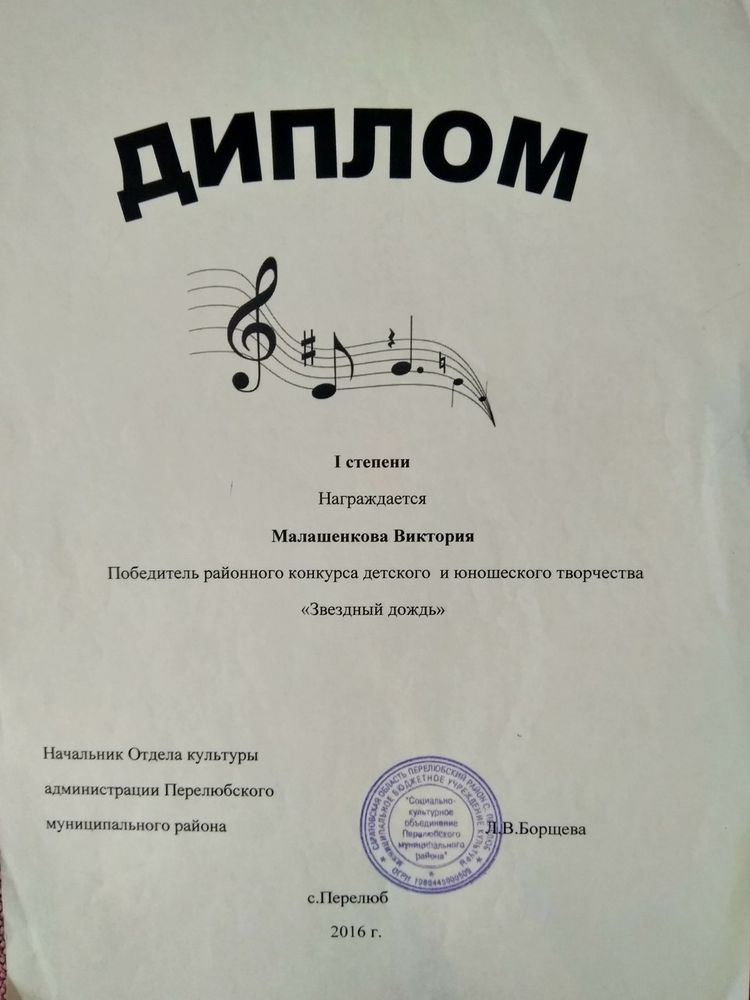 Диплом I степени победителя районного конкурса детского и юношеского творчества "Звездный дождь"