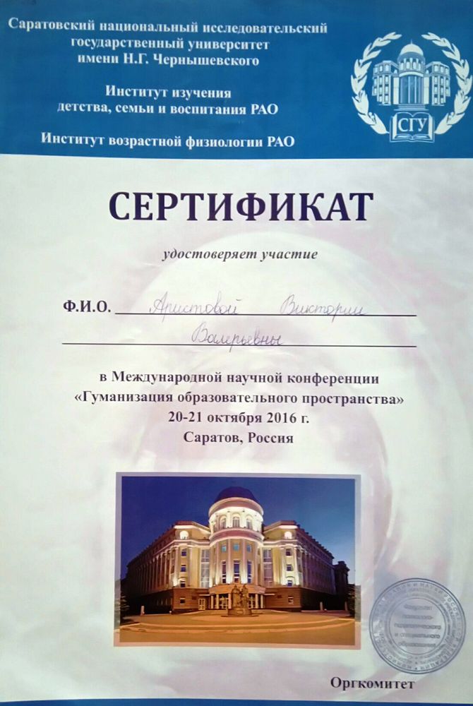 Сертификат участника в Международной научной конференции "Гуманизация образовательного пространства" ( 2016 год)