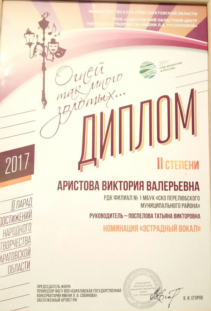 Диплом II степени во II параде достижений народного творчества Саратовской области ( 2017 год)