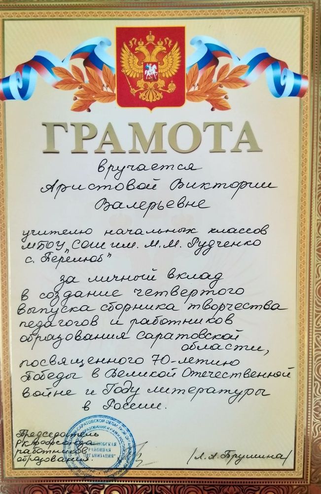 Грамота за личный вклад в создание четвертого выпуска сборника творчества педагогов и работников образования Саратовской области, посвященного 70- летию ВОВ и Году литературы в России