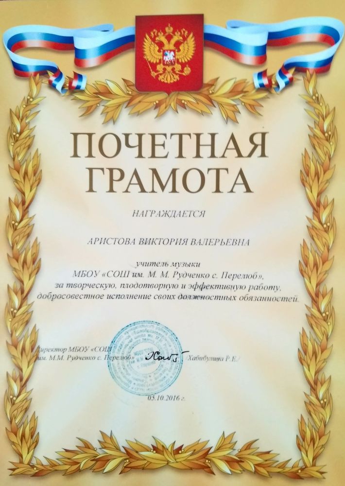 Почетная грамота директора школы за творческую, плодотворную и эффективную работу, добросовестное исполнение своих должностных обязанностей ( 2016 год)